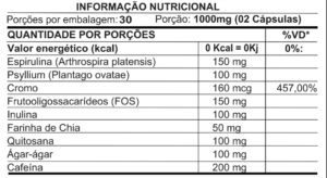 NOVA FÓRMULA: Spirulina, Psyllium, Cromo Quelado, Frutooligossacarídeos, Inulina, Farinha de Chia, Quitosana, Ágar-ágar, Cafeína.
